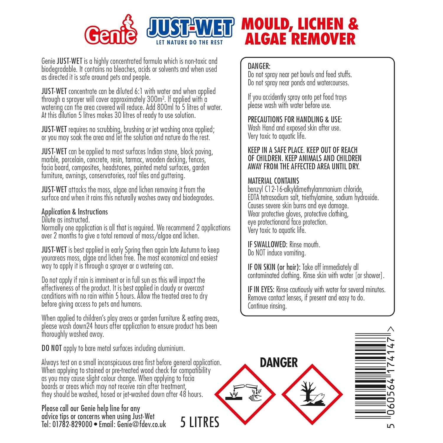 - Long-Lasting Protection: After application, Genie Just-Wet leaves behind a protective barrier that helps prevent future build-up of mould, lichen, and algae, keeping your outdoor spaces cleaner for longer.